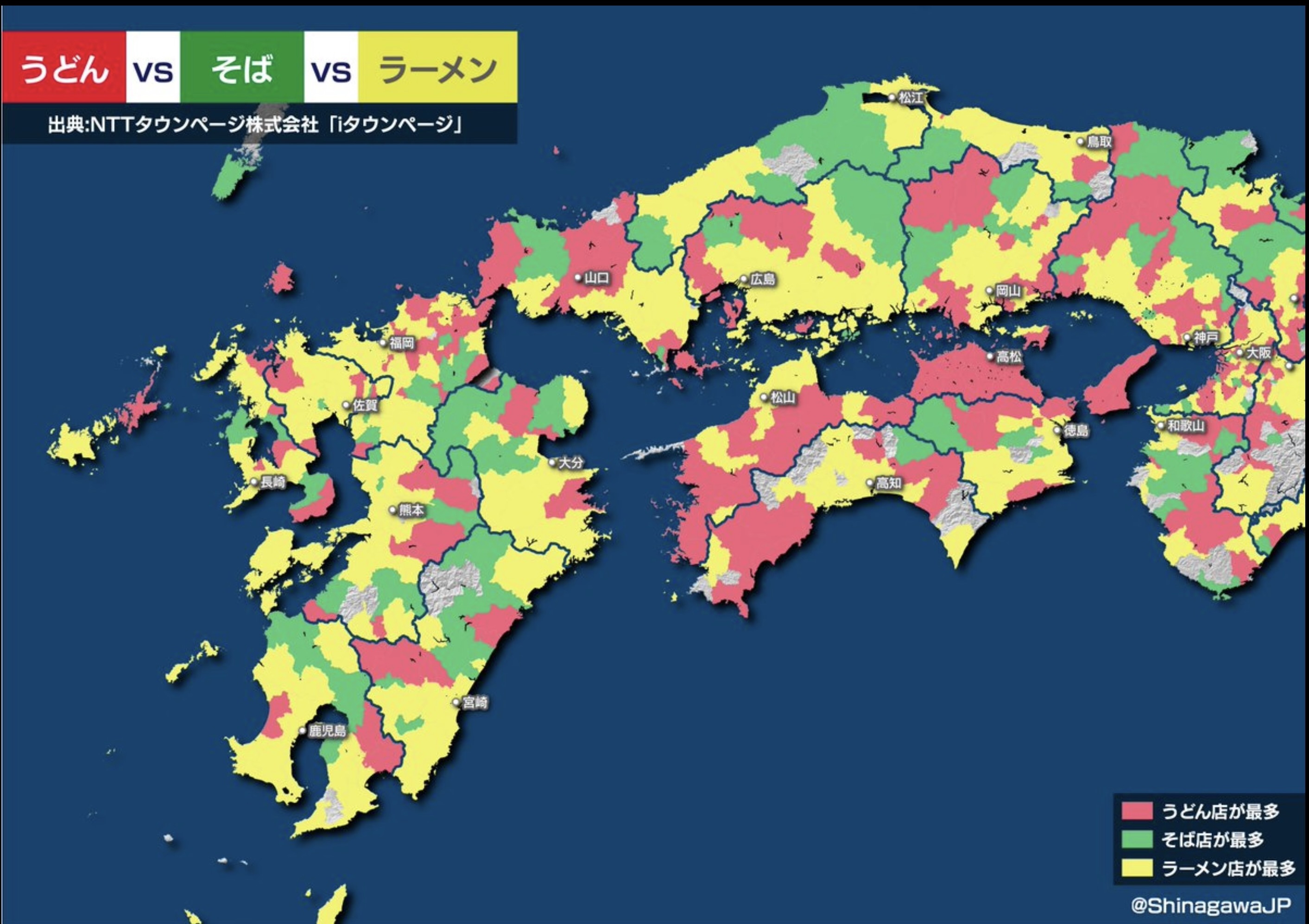 うどんvsそばvsラーメンの2021年市場地図がまた面白い。ラーメンは日本においてメジャーになってまだ50年そこそこに過ぎないが、既に饂飩、蕎麦市場を凌駕している。特に東北、北海道、九州、中国地方と市場への侵食が激しい。饂飩:17,999件、蕎麦:18,978件、ラーメン:24,370件、これが店の数比較になる。短期間で市場を席巻しているには幾つか理由がある。1つは、ラーメンの饂飩や蕎麦にない魅力だ。まず汁の種類、醤油、味噌、塩から選べ。更に出汁の豊富さ。豚骨、鶏がら、煮干し。具も野菜、チャーシュー、味付き卵、ボリューム感で饂飩、蕎麦を圧倒する。東北においてもはや饂飩店をラーメン屋が食っている理由はここにあるのではないか。2つ目は元来、日本人の遺伝子の中に外来のものを自然に取り入れる性質があるということだろう。考えてみれば、天ぷら、カツ、カレー、いつの間にか日本の料理に組み込んでいる。然ればラーメンは饂飩や蕎麦に置き換わるのであろうか、それはまずありえない。まず蕎麦、これは雑穀としての強みにある。”simple is best” 立ち食い蕎麦というコスパの良さもあるが、あっさりしていて胃もたれを起こさない健康食としての魅力もある。更に日本酒や焼酎との相性だ。江戸時代、江戸の街で蕎麦が流行ったのは白米中心による脚気の流行で蕎麦はその防止、しかも蕎麦と酒はセットだったようだ。食の歴史は贖えない。