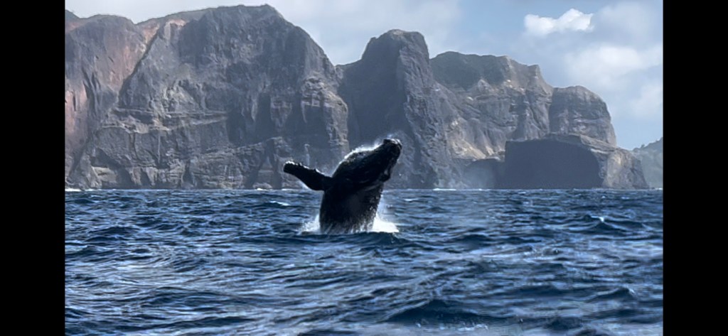 朝から凄い雨と風、体調最悪、流石にホエールウォッチングツアーは中止と思いきや、船長は出ると言う。既に代金を1万円以上払っている。払い戻しは効かない。致し方ない。黙って船ベリに齧り付いてクジラを見るしかない。果たして見られるかが問題だった。午前中嵐に耐え凌ぐと、船長の言う通り午後から晴れた。晴れたらザトウクジラが船に寄ってくるではないか!子鯨が、母鯨の背に乗って船の舳先近くを通ってくれた。苦あれば楽あり。何とか乗り切れた。小笠原父島の二日目。毎回鯨の姿が違うのが嬉しい。船長が言うには鯨のブリーチングは滅多に見られない。年に6回見られればいい方とのこと。ブリーチングする時鯨は吠える。ワオーと。本当か?想像するだけで身震いがする。何としても見てみたいものだ。果たして幸運は舞い降りるのか?