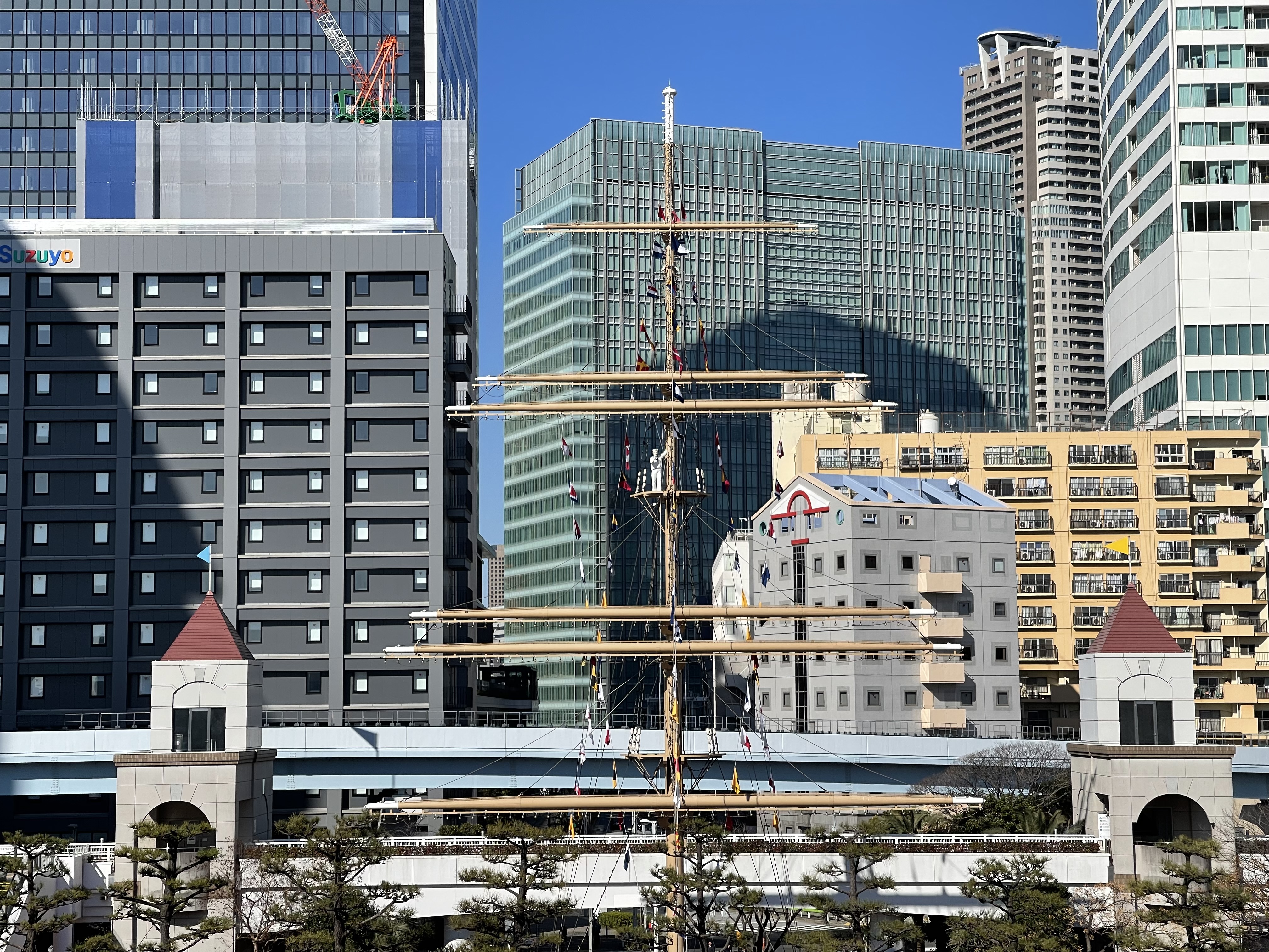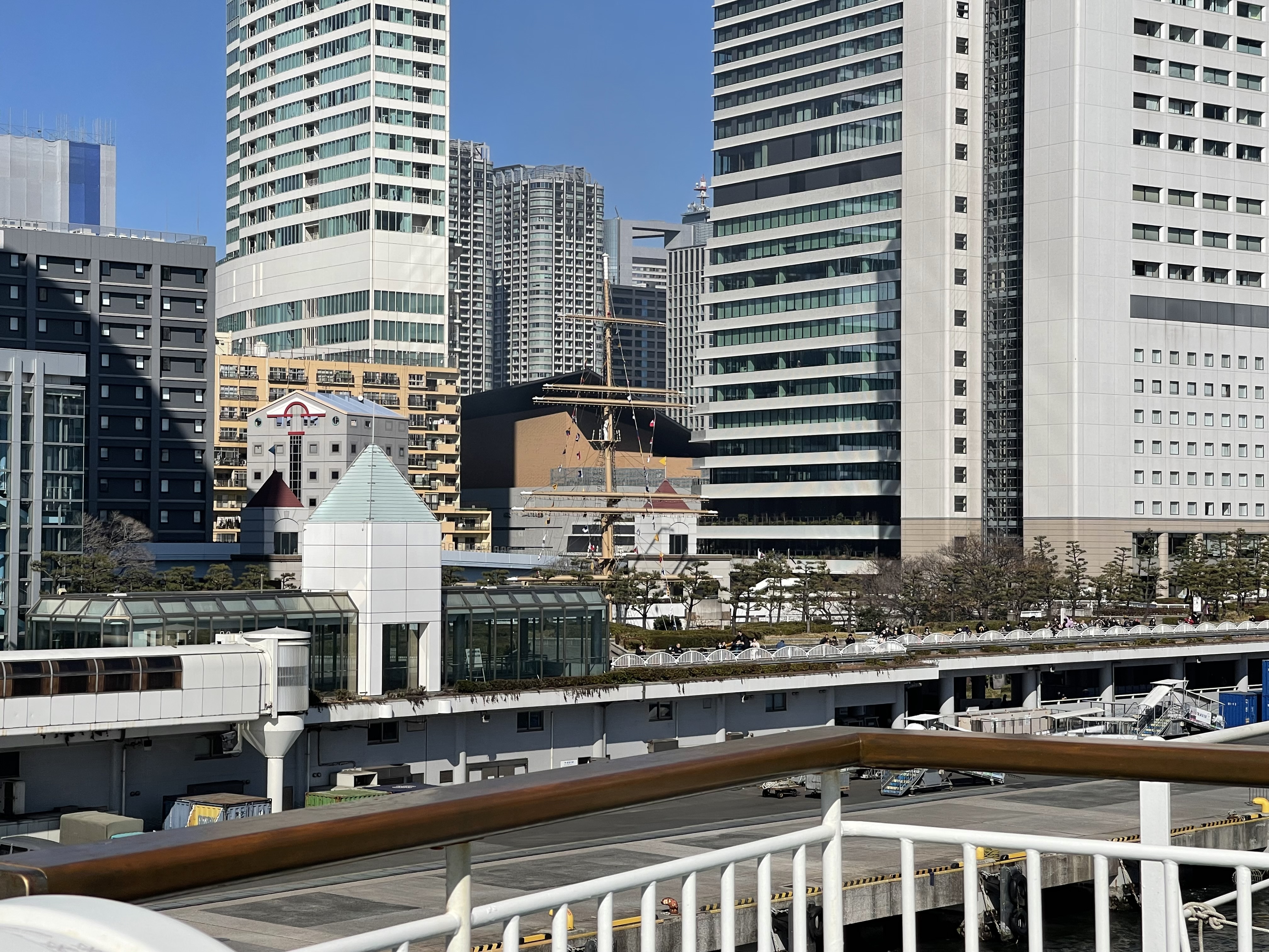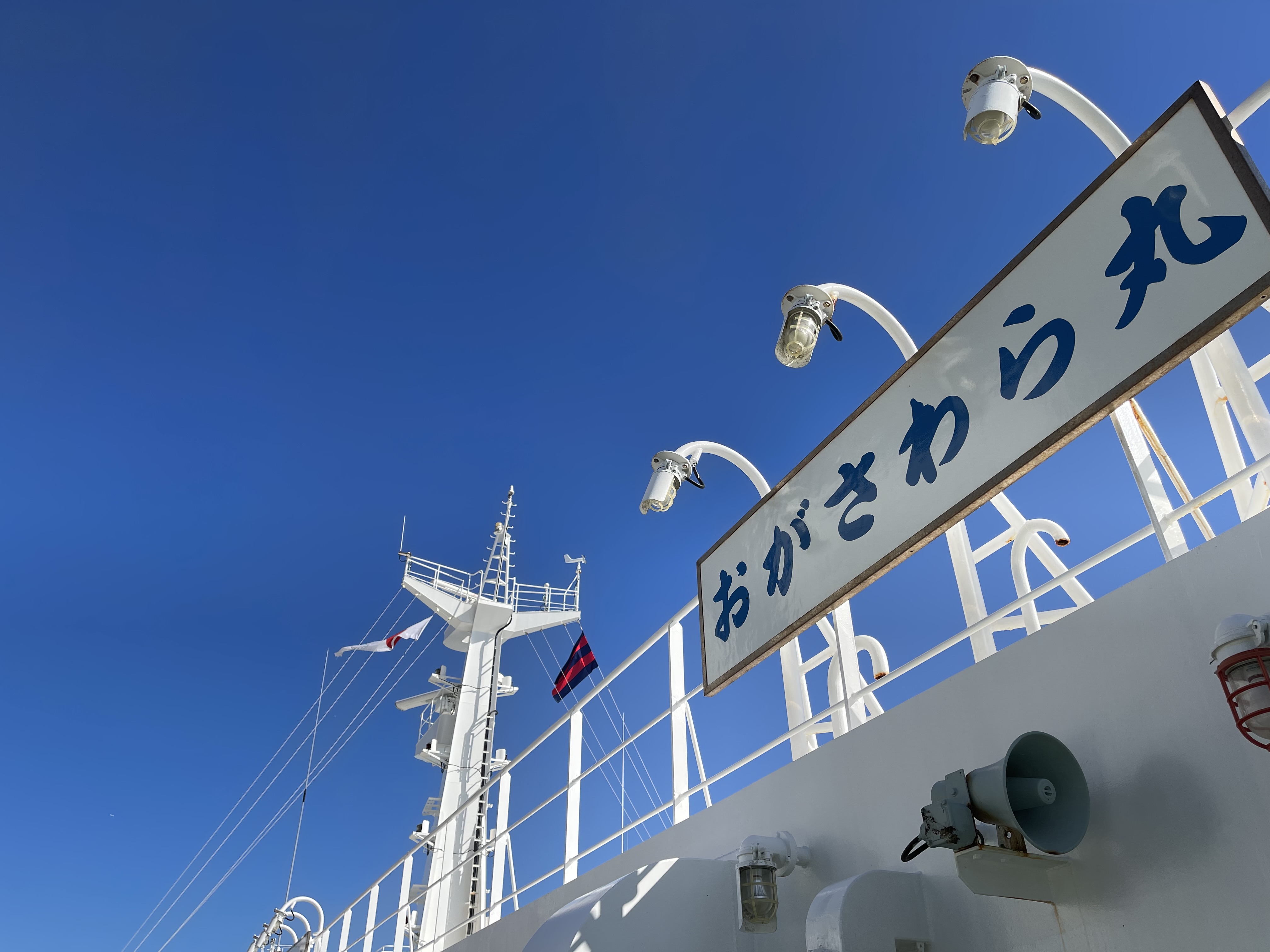 24時間の船旅は肉体的以上に精神的に堪える。何もない海の上、しかもこの時期は一年で最も寒い。乗船はJR浜松町駅から歩いて15分ほどで着く竹芝桟橋。沖縄や海外に行けない学生の手軽な旅先だった伊豆七島へ向かう港だった。久し振りに訪れてきれいになったことにまず驚かされた。変わらないのは桟橋のシンボルの帆と舵のモニュメント、そして新島モヤイ像。この日は天気が良く暖かだったので、夕暮れが迫るまでデッキで東京湾から三浦半島、房総半島、伊豆七島が望める景色を楽しめた。デッキは眺望も良く、出航時から、スカイツリー、東京タワーまで望め、更にレインボーブリッジを越え、羽田沖で飛行機の離着陸、湾外へ抜ける際は海ほたる、東京湾に迫る房総半島や三浦半島の山並み、間近に大島から八丈島まで伊豆七島を眺めながら遥か小笠原に向かうことを実感できる。
