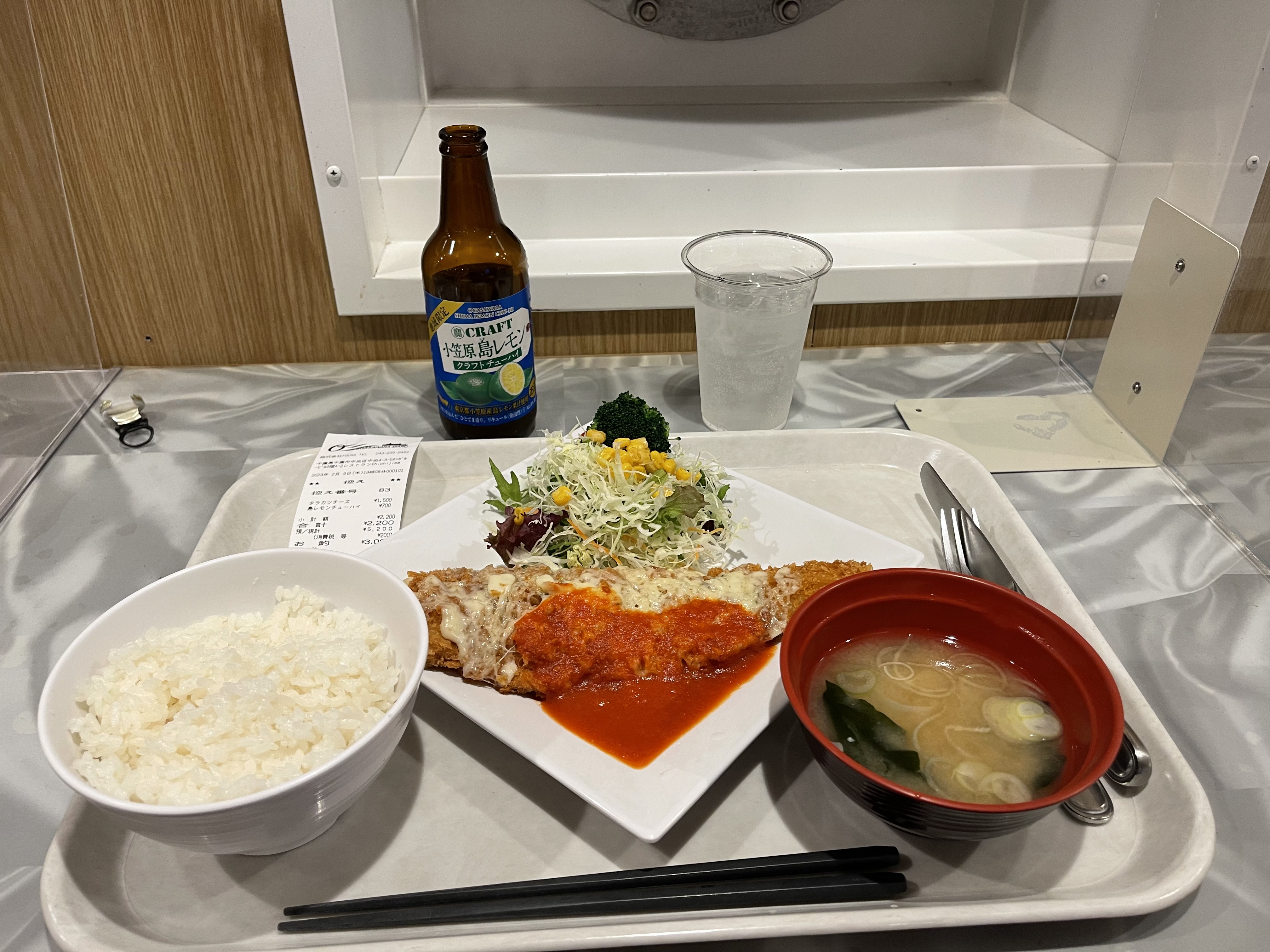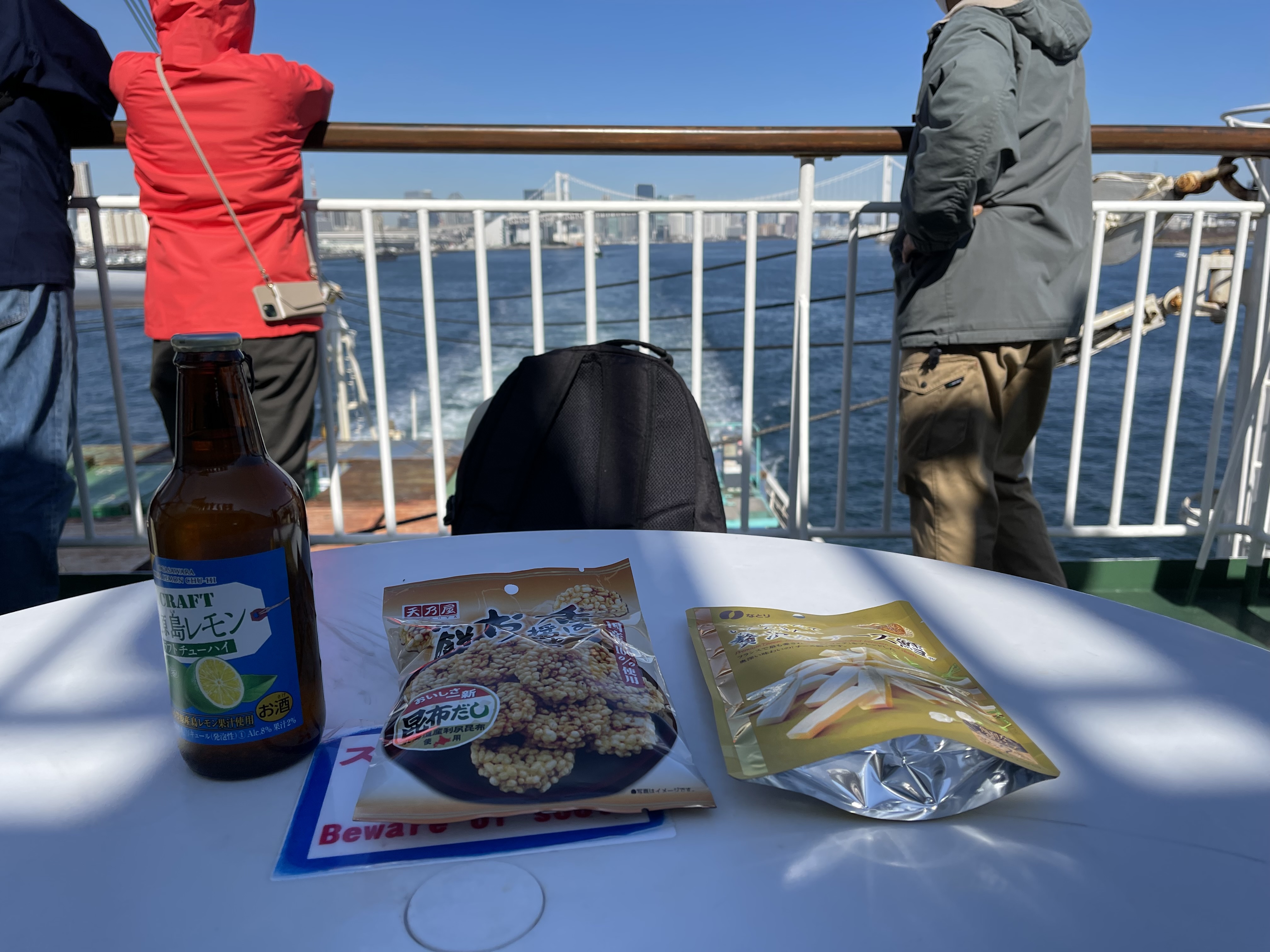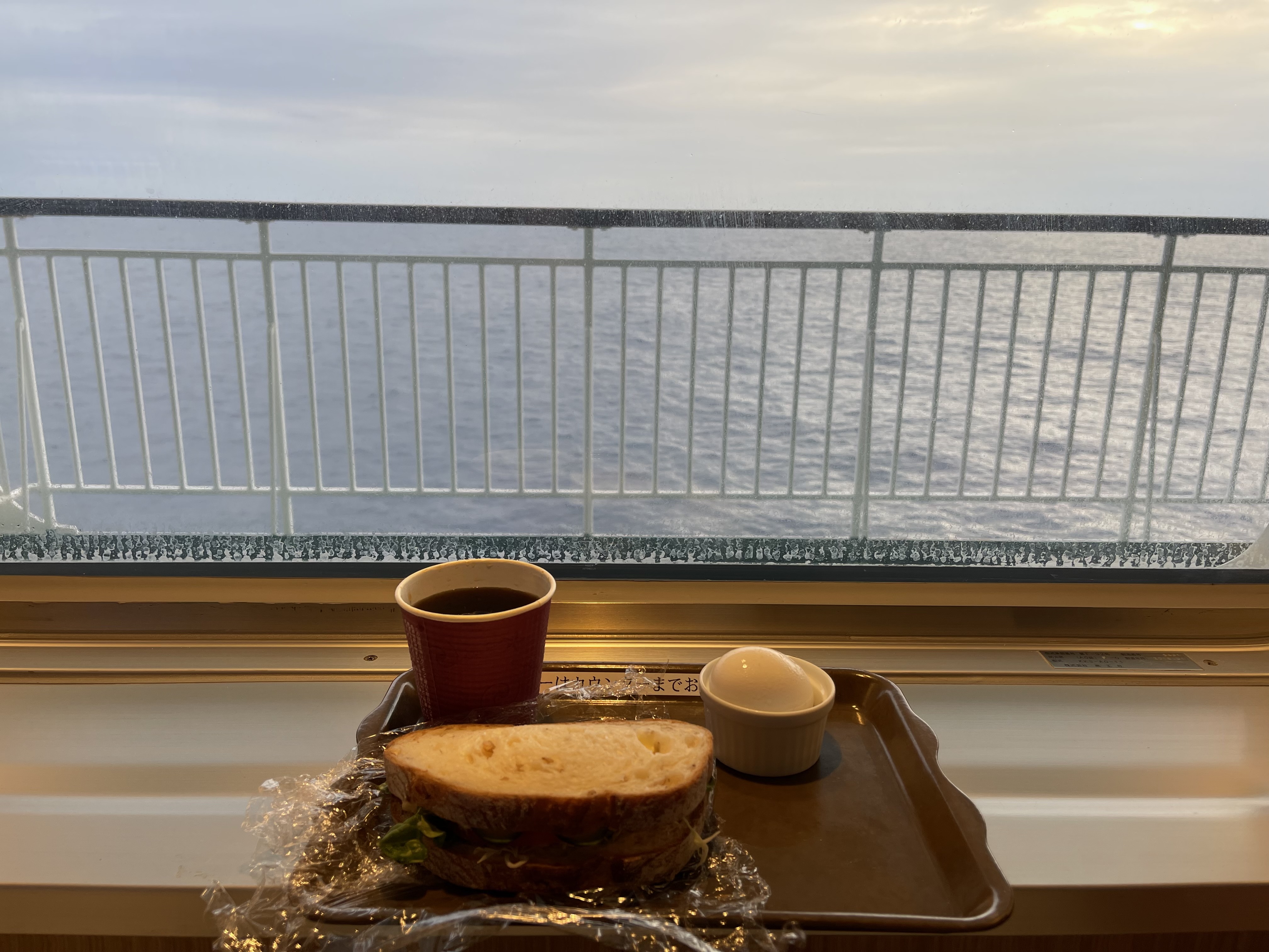 食事は船賃にセットになっていない。高くなるのは致し方ないだろうが、酒と定食で2000円は下らない。カップ麺は船内で売っているので、安上がりに済ます手はあるが、寂しいので、基本は地酒の酎ハイ小瓶700円、島レモンもしくは小笠原パッションとした。少々高いが小笠原パッションがキリッとした味が出ていて美味い!お薦めだ。昼はデッキで飲んだ後、レストランChichi-jimaで島塩ラーメン900円、夜は小笠原パッションチューハイと長芋漬けと軟骨唐揚げ、計1,800円、翌朝は展望ラウンジHaha-jimaで朝日を眺めながらサンドイッチとゆで卵とコーヒーで750円、まあこれで十分だった。