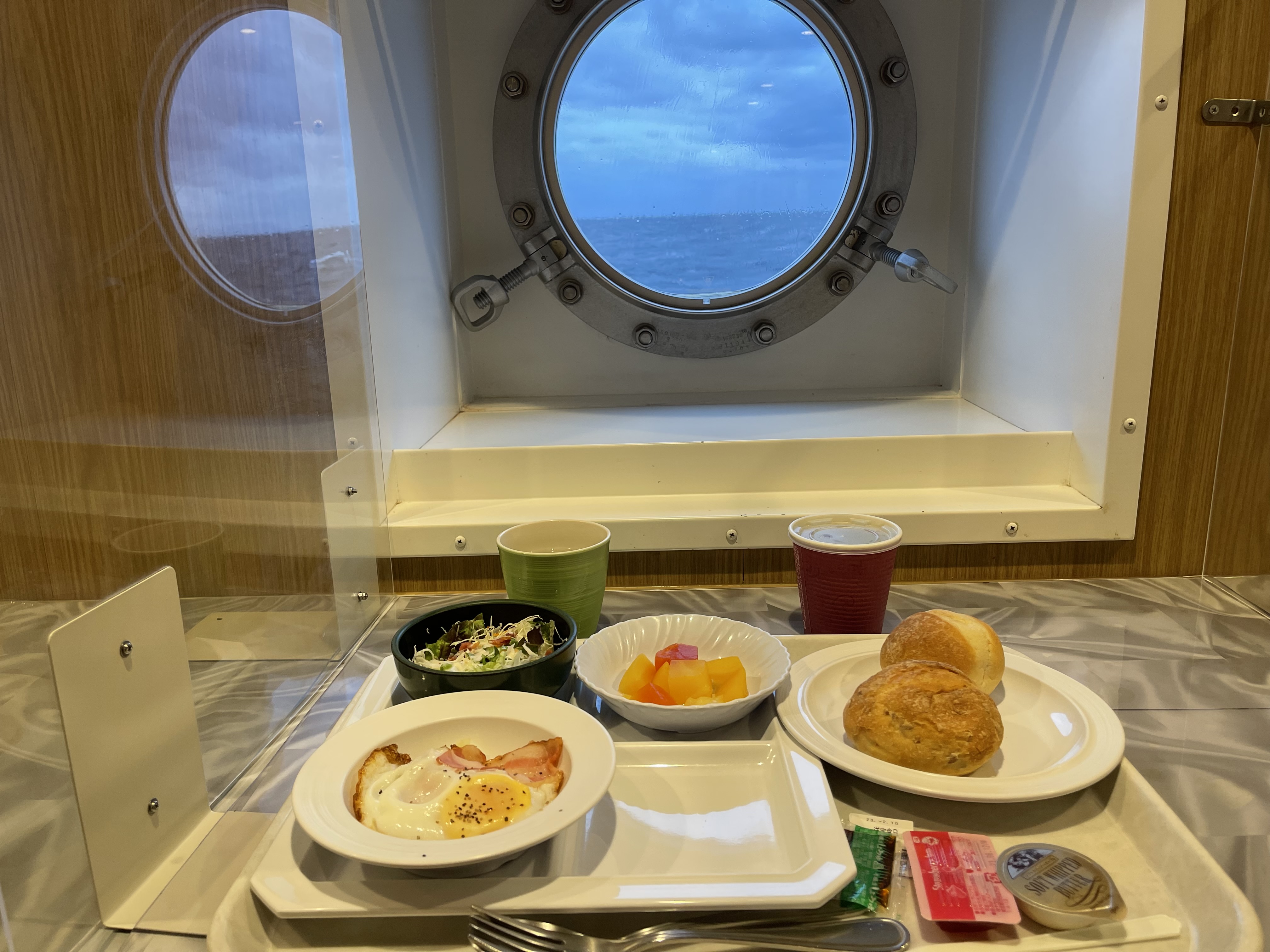 帰りの船で:午後3時乗船なので、夕暮れが近いことから船内で過ごすことが多くなる。船内は静かだった。嵐の前の静けさか。内地は雪と予報では告げており、船外デッキは立っていられないほど風が強く、寒くなっていく。船は揺れた。到着は1時間遅れることになる。展望ラウンジHaha-jimaはお陰で空いている。荒れた海を望みながらコーヒーを啜っていた。晩御飯は奮発してレストランChichi-jimaでタラカツチーズ定食と小笠原レモン酎ハイ計2,200円也、タラのカツは衣サクサク、衣にチーズが絡んで旨味を増す。中のタラはジューシー、なかなかだ。島レモン酎ハイは癖がなく、何の食事にも合う。満足の一品。翌朝もモーニングもレストランChichi-jima、500円でサラダ、目玉焼き、パン2個とフルーツはリーズナブル。コーヒーは250円で別途。丸窓から朝の海を望みながら朝食は格別。昼は展望ラウンジHaha-jimaで最後の食事島塩ハチミツトーストとホットコーヒー1,300円、少々高いが、アイスクリームとハチミツで焼きたて厚切り食パンは味がパンに染みて美味い。尚、後でわかったが、行きと帰りで100円クーポンを使えたようで、失敗した。
