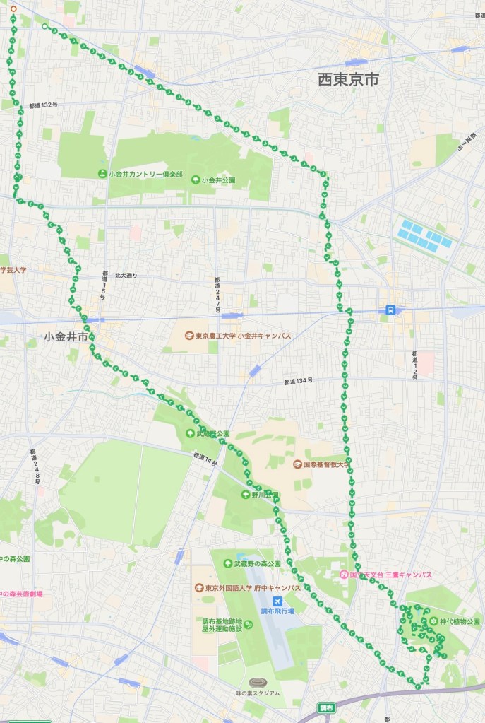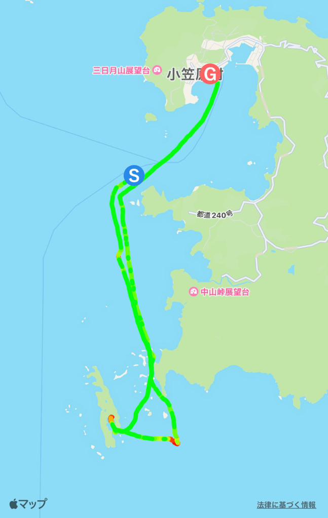 ホエールウォッチングルート(緑色)と鯨のブリーチングが見られた場所(海上の最南東の赤色部)